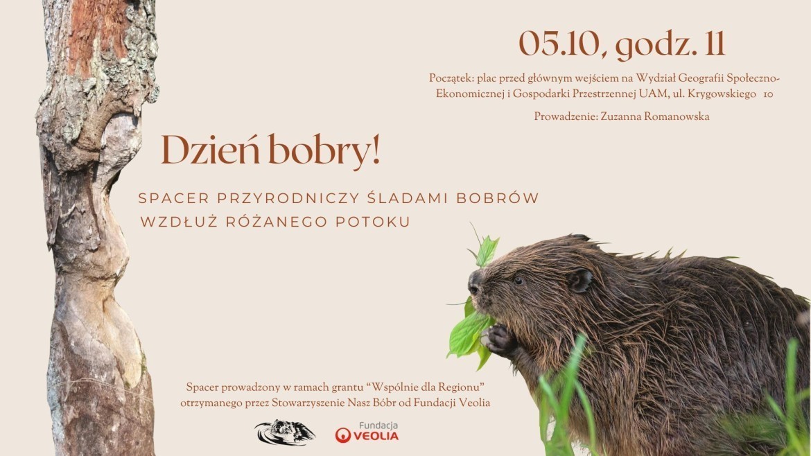 Spacer nad Różanym Potokiem to okazja, aby z bliska poznać zwyczaje bobrów, które żyją tuż obok kampusu i osiedla. Uczestnicy dowiedzą się, czym się żywią, jak budują swoje domy i jak wpływają na cały ekosystem. Przewodniczka opowie także o ich życiu rodzinnym, a także o mniej oczywistych ciekawostkach, m.in. o specjalnym pazurze do czesania czy kaprofagii. Trasa nie będzie trudna, jednak organizatorzy zalecają założenie butów i spodni odpowiednich do chodzenia po lesie.