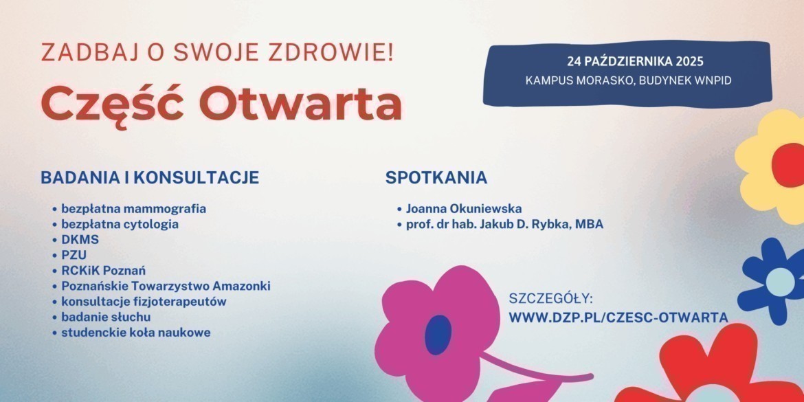 Na Uniwersytecie im. Adama Mickiewicza odbędzie się kolejna edycja Dnia Zdrowia Psychicznego, poświęcona edukacji, profilaktyce i wspólnemu dbaniu o dobrostan w środowisku akademickim. W programie zaplanowano warsztaty, wykłady ekspertów, sesje Q&A, zajęcia mindfulness i aktywności sportowe. Pojawią się także gościnne wystąpienia, m.in. Joanny Okuniewskiej, oraz część otwarta z prezentacjami kół naukowych.