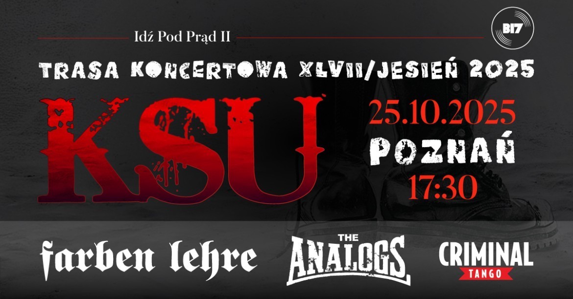 W ramach trasy „Idź pod prąd II” w Poznaniu zagra zespół KSU, jedna z legend polskiego punk rocka. Na scenie pojawią się także goście specjalni – Farben Lehre i The Analogs, a koncert otworzy Criminal Tango.