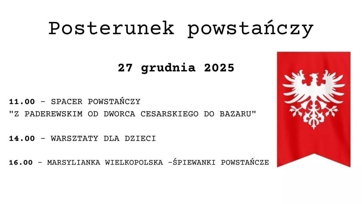Ulica Święty Marcin zajmowała kluczowe miejsce w pierwszych dniach Powstania Wielkopolskiego. To wzdłuż niej znajdowały się punkty organizacyjne i komunikacyjne w pierwszych dniach walk, a jej okolice tętniły aktywnością powstańców, kurierów i ochotników zgłaszających się do oddziałów. I to właśnie na tej ulicy odbędzie się kilka kolejnych atrakcji w związku z rocznicą wybuchu powstania. O 11:00 rozpocznie się spacer powstańczy “z Paderewskim od Dworca Cesarskiego do Bazaru”, o 14:00 zorganizowane będa warsztaty dla dzieci. Wydarzenie zakończy się śpiewankami powstańczymi.