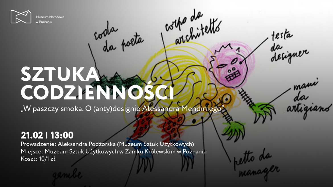 Na jednym ze swoich rysunków Alessandro Mendini przedstawił siebie samego jako smoka z głową projektanta, tułowiem architekta, klatką piersiową managera, dłońmi rzemieślnika, nogami grafika, stopami artysty i ogonem poety. Spotkanie z tym projektowym potworem będzie opowieścią o designie totalnym, o zmęczeniu pięknem i funkcjonalnością oraz o walce o nowe rzemiosło. Uczestnicy przyjrzą się, jak przepełniona poetyckością, empatią i ironią twórczość jednego z największych włoskich projektantów zmieniła spojrzenie na przedmioty codziennego użytku.