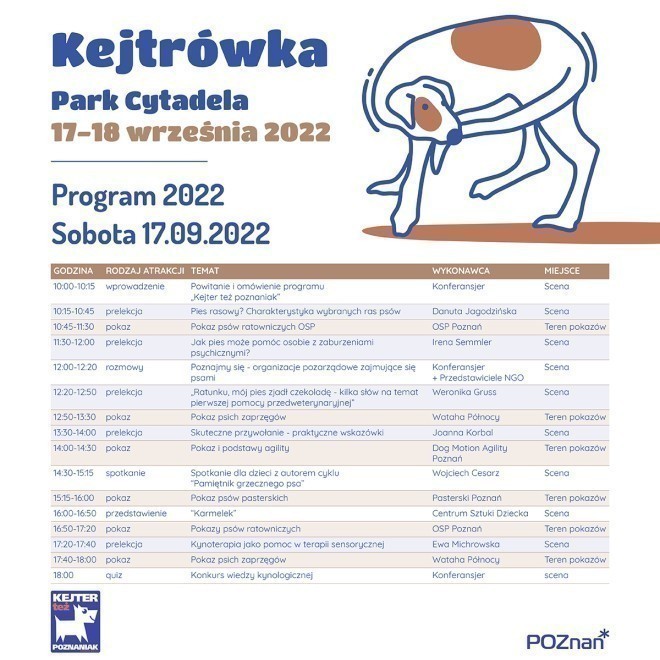 W ramach pikniku edukacyjnego dla właścicieli i miłośników psów, czyli "Kejtrówki 2022" zaplanowano wiele atrakcji. W specjalnym punkcie informacyjnym Poznańskiego Schroniska dotyczącym czipowania zachęcać będziemy do aktualizacji danych rejestrowych właścicieli poznańskich kejtrów. W punkcie Straży Miejskiej zasięgnąć będzie można informacji na temat m.in zasad korzystania z terenów parkowych, wybiegów czy sprzątania nieczystości po swoim psie. Rozdawać będziemy poradniki kejtrowe oraz woreczki na psie nieczystości. Liczne punkty fundacji prozwierzęcych promować będą swoją działalność oraz odpowiedzialną adopcję.