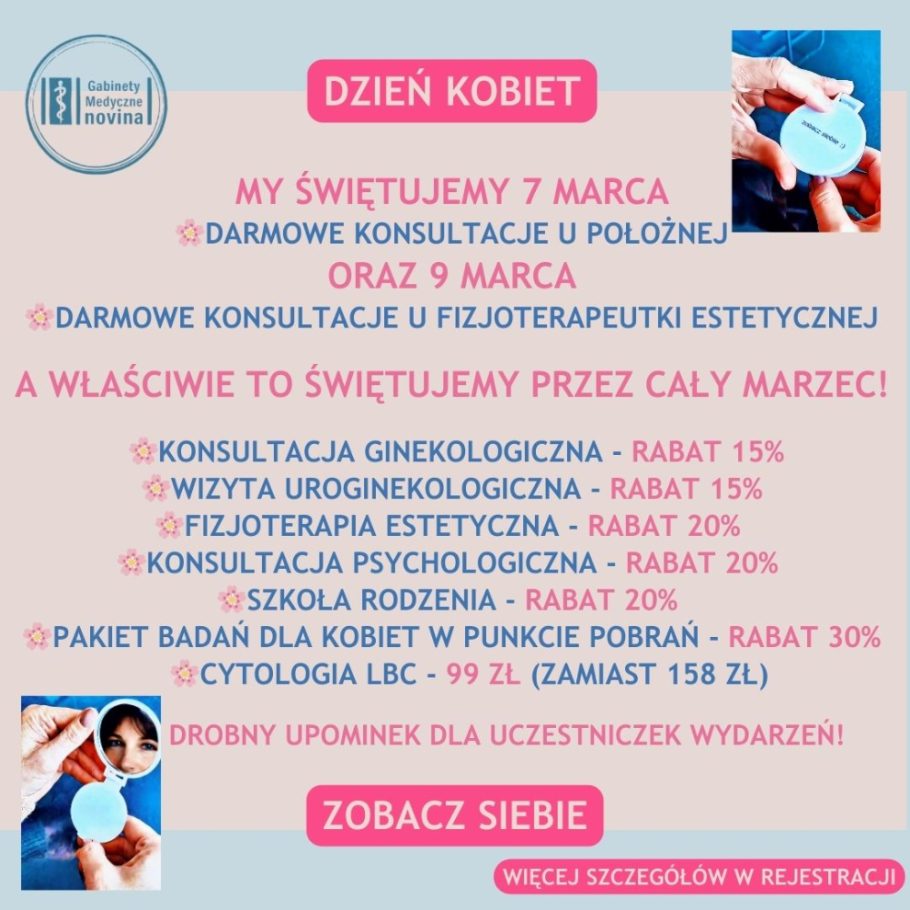 Z okazji Dnia Kobiet zapraszamy w sobotę 7 marca na bezpłatne konsultacje z położną mgr Katarzyną Urbańską (8:00–12:00) oraz w poniedziałek 9 marca na bezpłatne konsultacje z fizjoterapeutką estetyczną mgr Pauliną Grzelak (12.00–14.00).