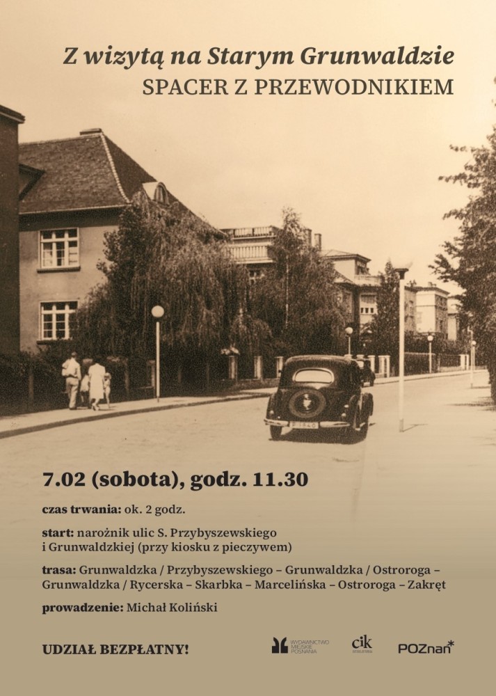 Przechadzka będzie okazją do wspólnej rozmowy o ważnych postaciach międzywojennego Poznania oraz o współczesnych mieszkańcach Grunwaldu, a także do podzielenia się z innymi uczestnikami własnymi wspomnieniami. Trasa spaceru opracowana została na podstawie publikacji Wydawnictwa Miejskiego Posnania pt. „Na Starym Grunwaldzie. Domy i ludzie. Rewizyta” autorstwa Piotra Korduby i Aleksandry Paradowskiej.