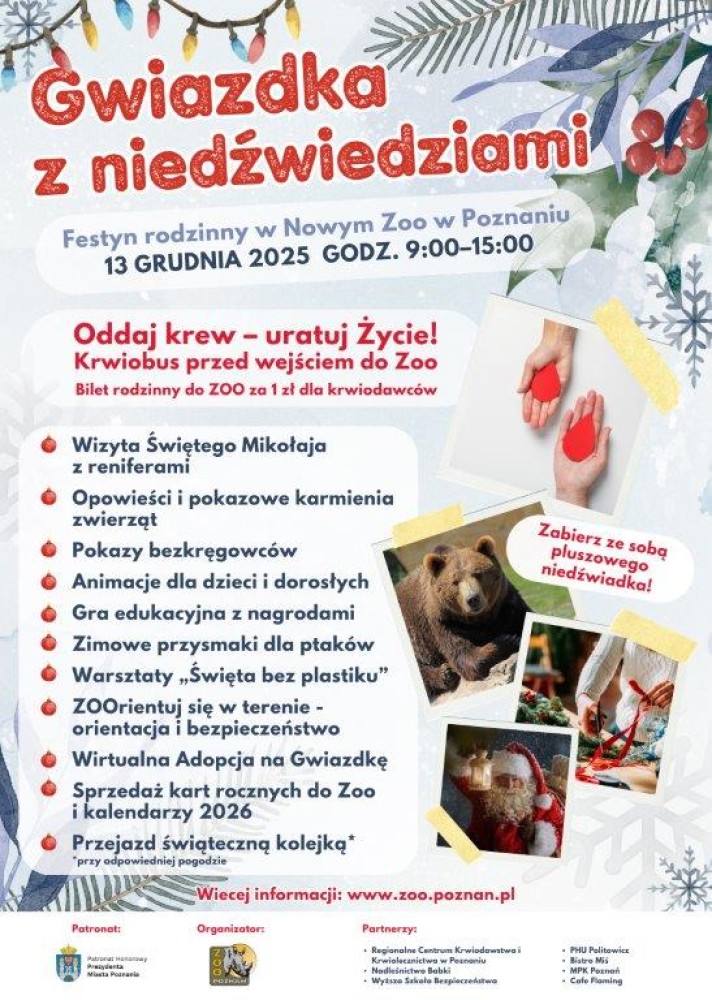 Przede wszystkim przyjść do Nowego Zoo - w sobotę, 13.12 w godzinach 9.00 - 17.00 . Przy wejściu do Nowego Zoo pierwsza okazja do zrobienia rzeczy ważnej. Na chętnych czekać będzie krwiobus. Każda osoba, która odda krew otrzyma rodzinny voucher (2 dorosłych + 3 dzieci do 18 lat) na wejście do Nowego Zoo w dowolnym dniu od 13.12.2025 do 30.06.2026.