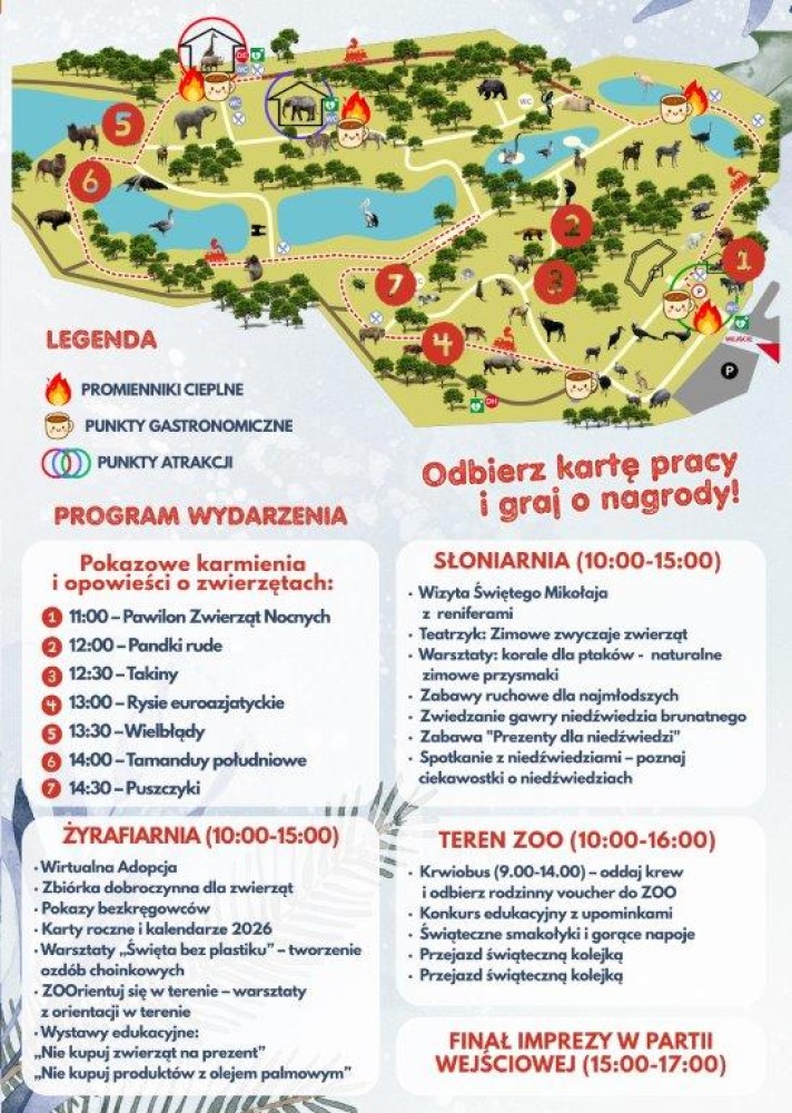 W Pawilonie Żyraf i Nosorożców czarnych ( a więc pod dachem!!!), w godzinach: 10.00 - 15.00: strefa edukacji, ekologii i zimowych inspiracji, czyli: